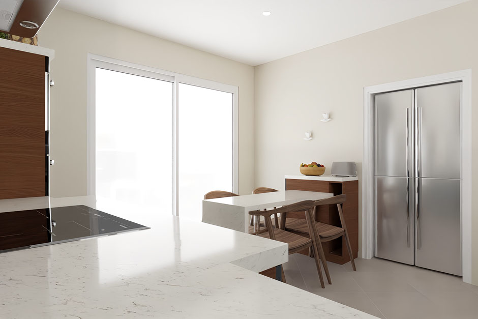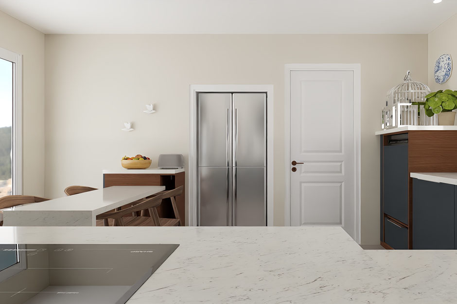 Nous avons repensé l’agencement afin d’intégrer un réfrigérateur américain, en récupérant intelligemment une partie de l’espace du cellier.