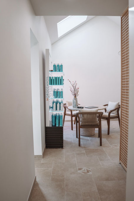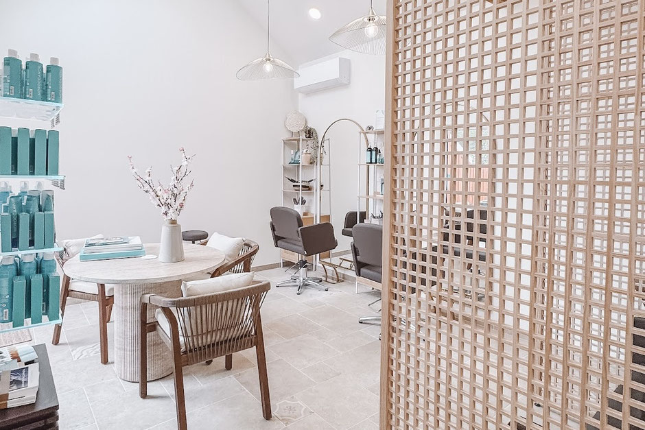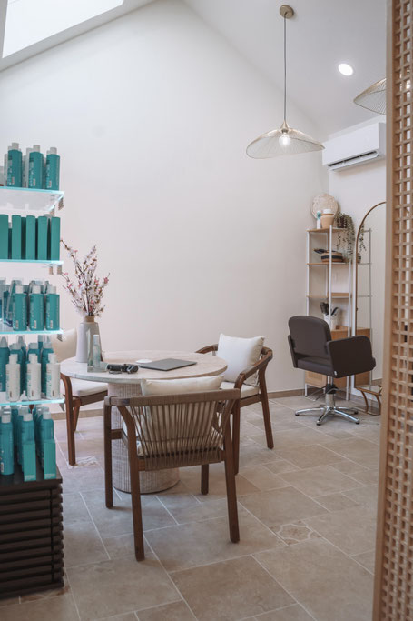 Le programme comprenait une entrée accueillante, une table de convivialité, deux postes de coiffage, deux bacs de lavage, une salle de massage, une onglerie et une