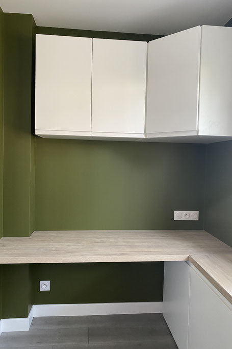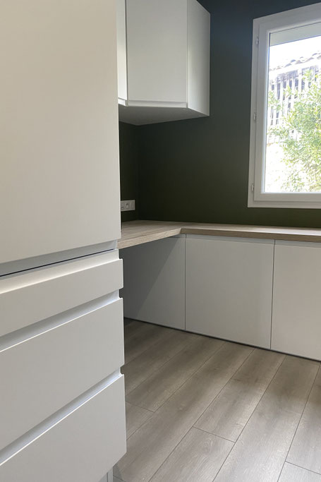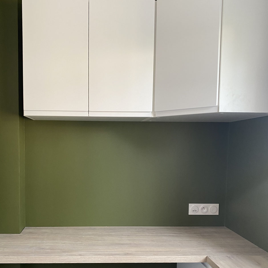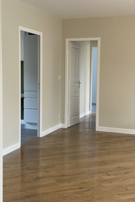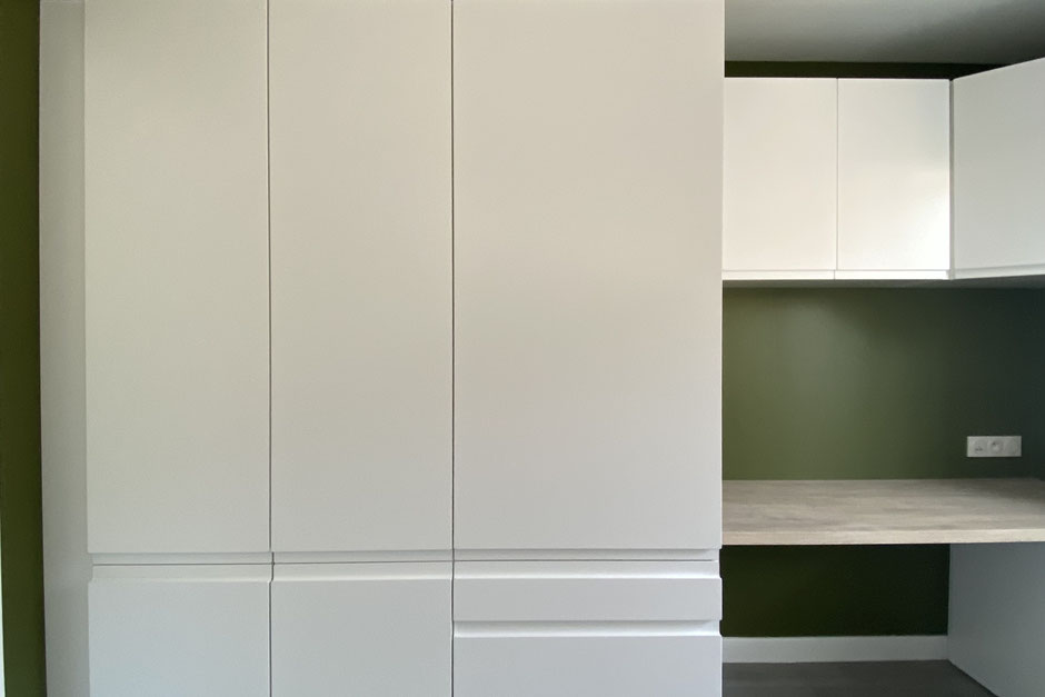 Le programme comprenait la création d’un bureau aménagé à proximité du salon, l’unification des sols du séjour, l’aménagement d’un dressing sur mesure dans la