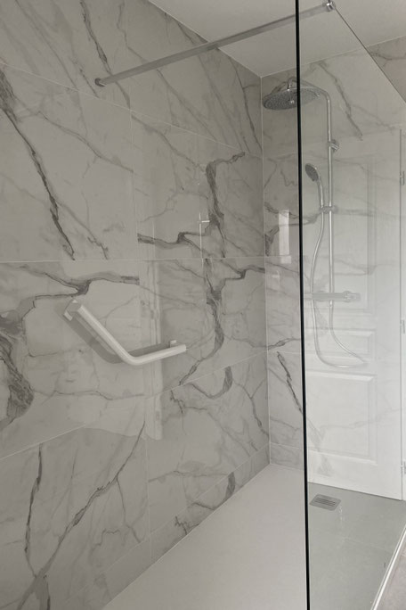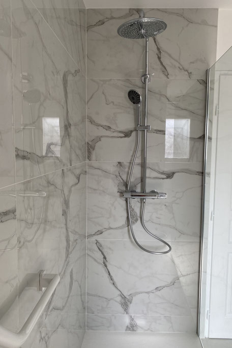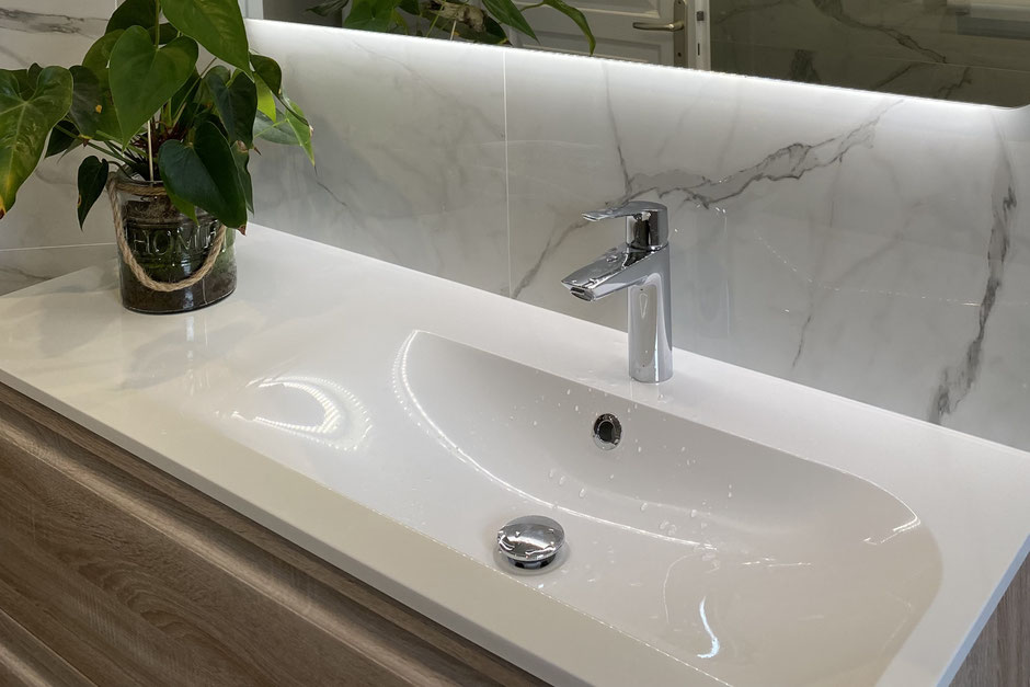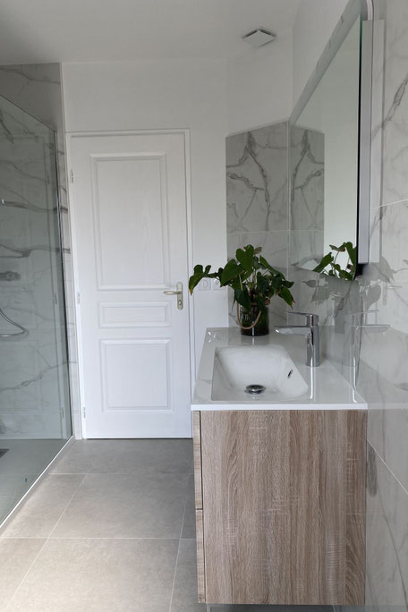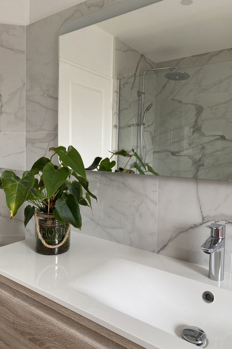 chambre, et la conception d’une salle de bain à la fois raffinée et facile à entretenir — avec, comme fil conducteur, le marbre décliné au sol et sur les murs.